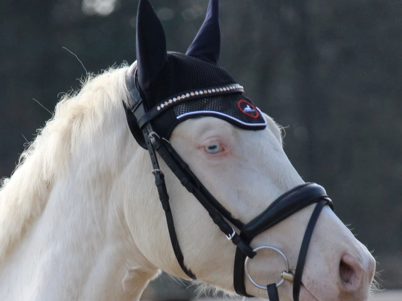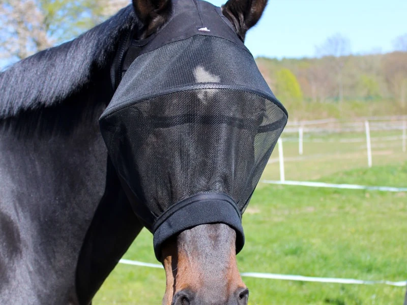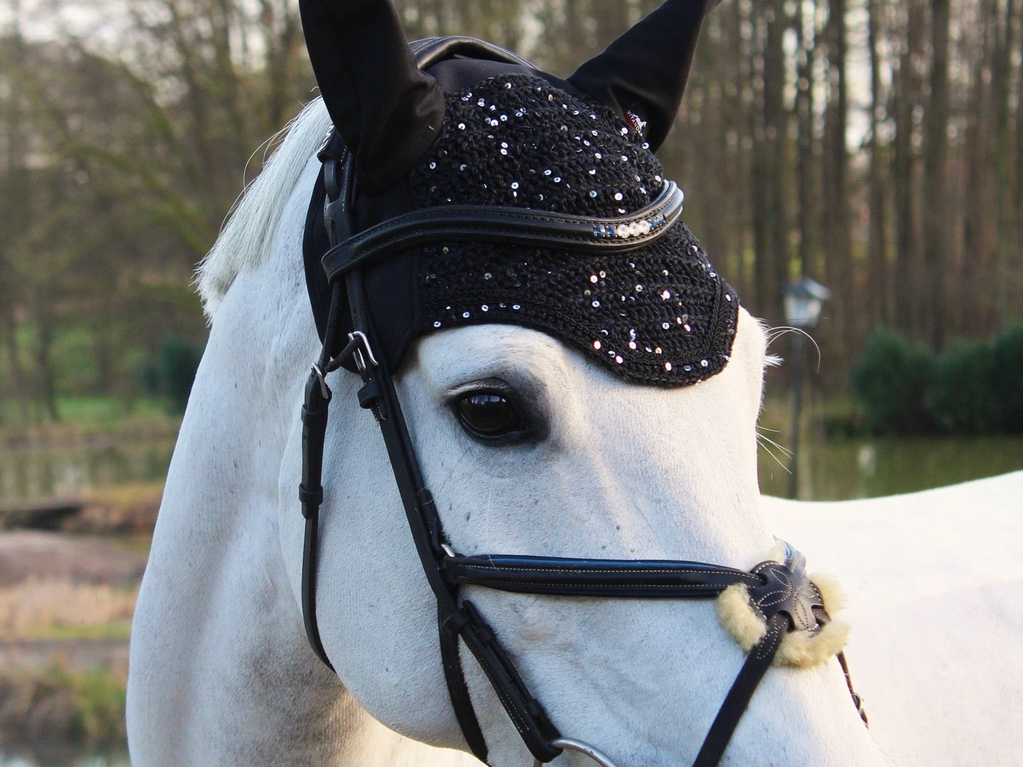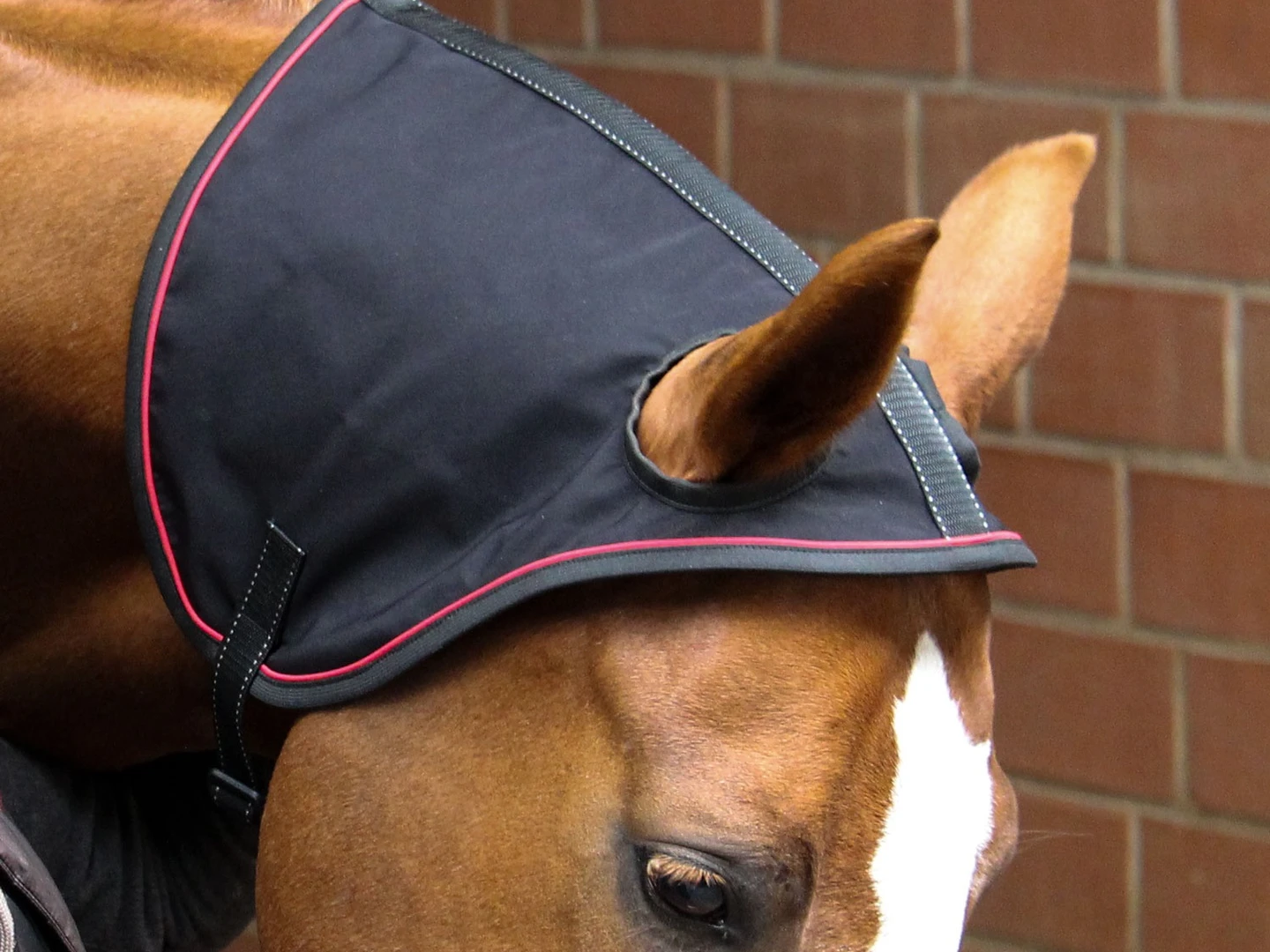 Diese geräuschdämmende Fliegenmütze hat die Ohren aus einem schallschluckenden Material. So kann sich das Pferd besser auf seinen Reiter konzentrieren.